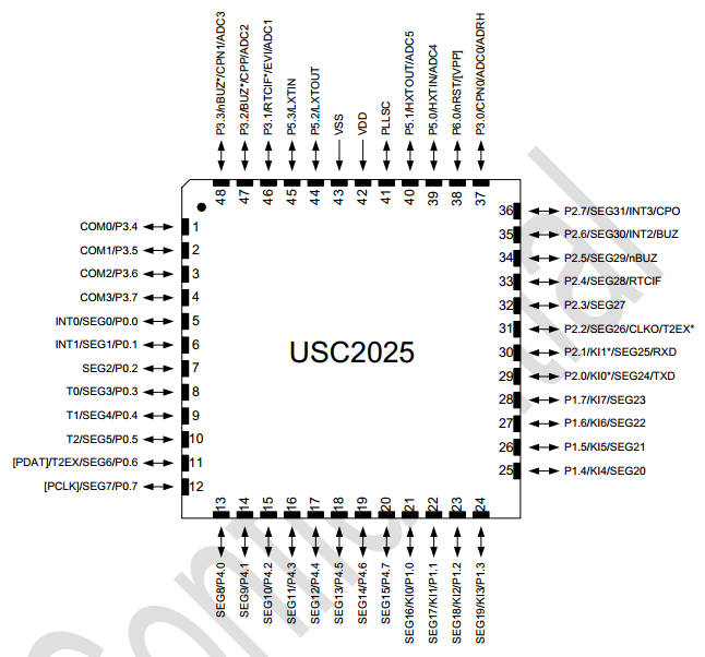 USC2025 is a 8-bit MCU based on enhanced 51 core. It integrated 6+2-Ch/12bit-ADC and 128-seg LCD, embeds16K-byte OTP and 512-byte RAM, also PLL, RTC, UART, Comparator and Timers/Counters.